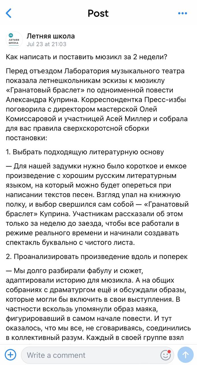 Как итог - готовый эскиз мюзикла, 10 музыкальных номеров, отработанные навыки, результативный нетворкинг и горячие импульсы творить дальше. И все это за 2 недели